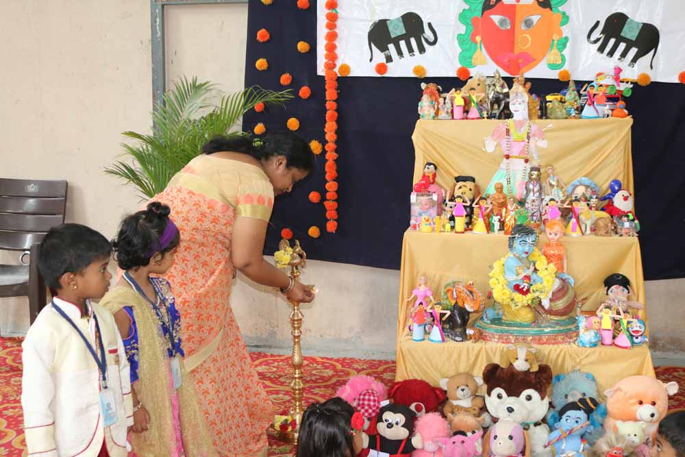 Dasara is the celebration of the triumph of the good over the evil, was celebrated in our school with lot of religious zeal. The festival is celebrated to honour the slaying of the demon Ravana by Lord Rama. To makes sense, we celebrated Dasara to teach children about it and acquainting them about the customs in a different way. Our teachers decorated the ground by arranging toys. The celebration started by drawing elephant (Ambari) picture and showed the video to learn the purpose of celebrating dasara and celebration continue with Dandiya dance for the beat.All the children enjoyed the day and the celebration ended by giving paper dolls to children as a take away.