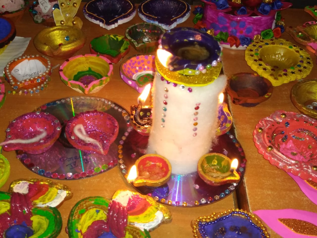 We conducted the co-curricular activity of Diya Decoration on 24-10-19 for class I to IV.Students were participated very happily and they made beautiful diyas by using paints,stickers and colourful stones.The activity helped the students to showcase their creativity and they were a decorator for themselves.They displayed their creativity by decorating the earthen lamps beautifully. Children also learnt about the significance of lighting Diyas on Diwali.