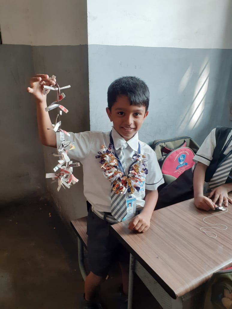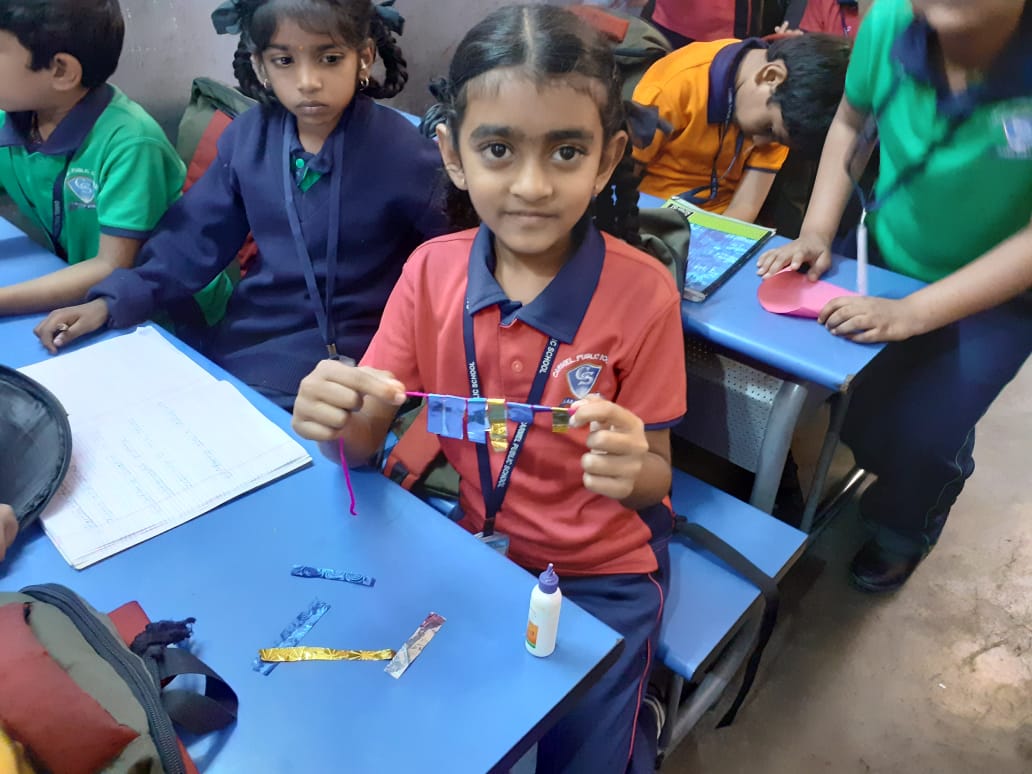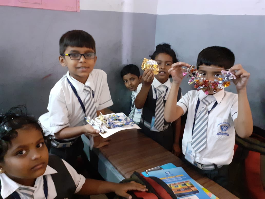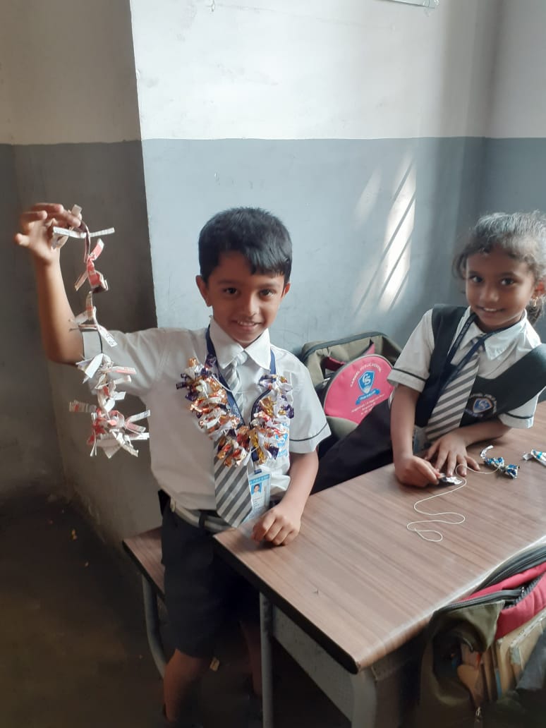 We conducted the Co-curricular activity on 07-11-19. Students from I to IV standard participated in making garlands using chocolate paper. They were using different materials like chocolate papers, thread, stickers to make colourful garlands. As this activity helped the students to show case their creativity in making beautiful garlands. Students participated joyfully and they were excited.