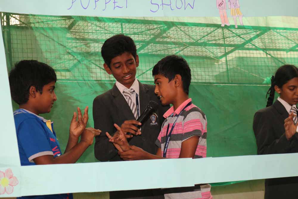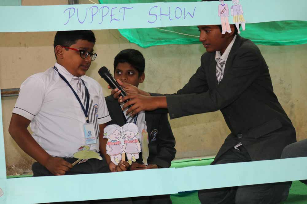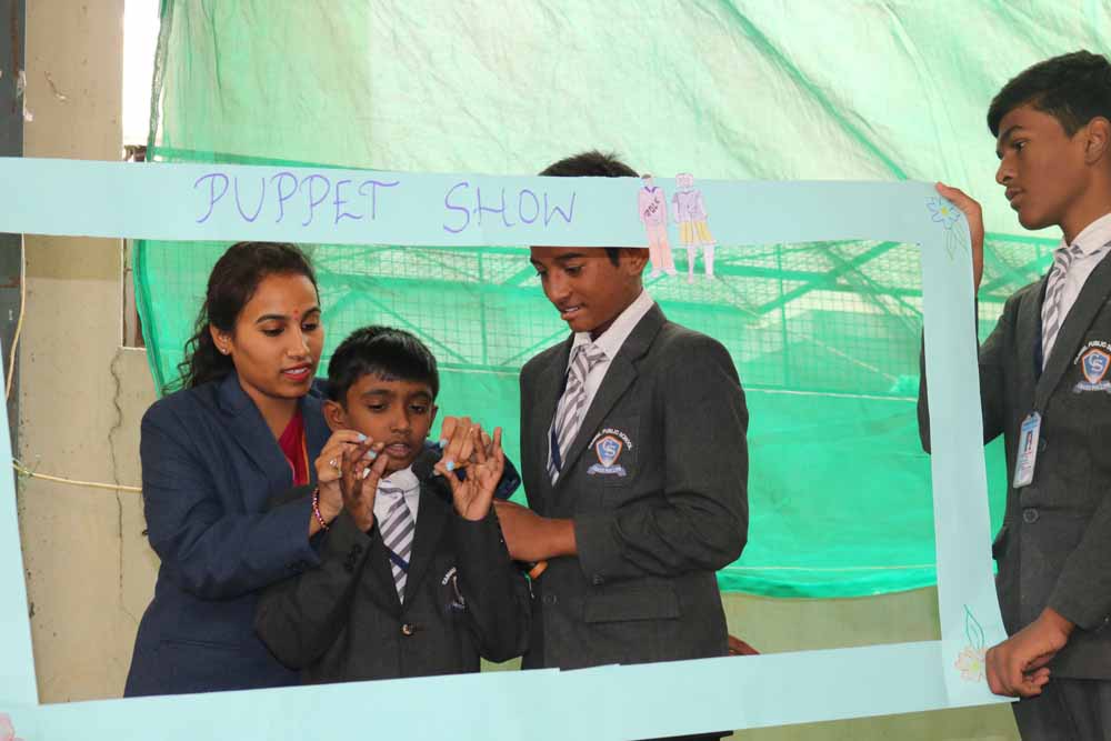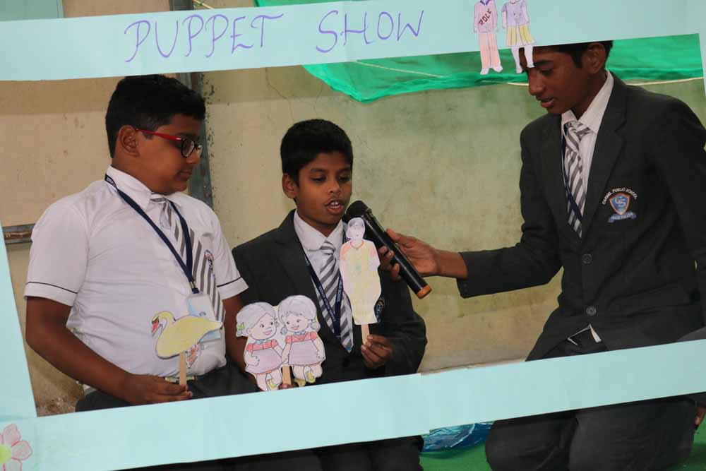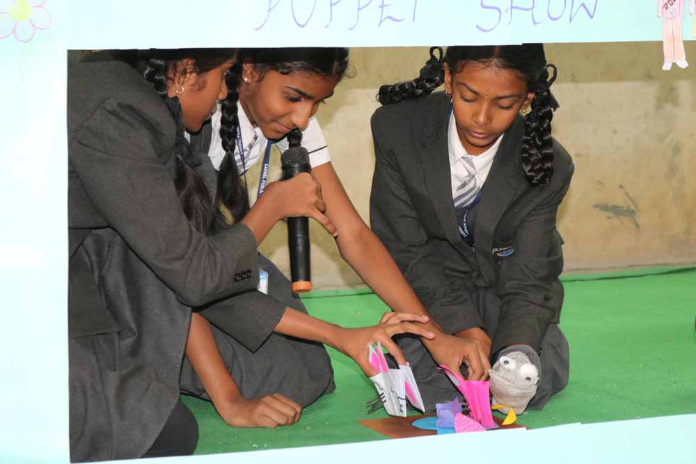 “Puppet show” competition had been conducted as a co-curricular activity.Students from V std to X std participated in this competition.Students had used different types of puppets like finger and sock puppet in the show.They had used rods,fingers,strings for the movements of puppets.Students not only played the puppet but also told the moral of the story.This activity helped the students to concentrate and capability of memorizing.